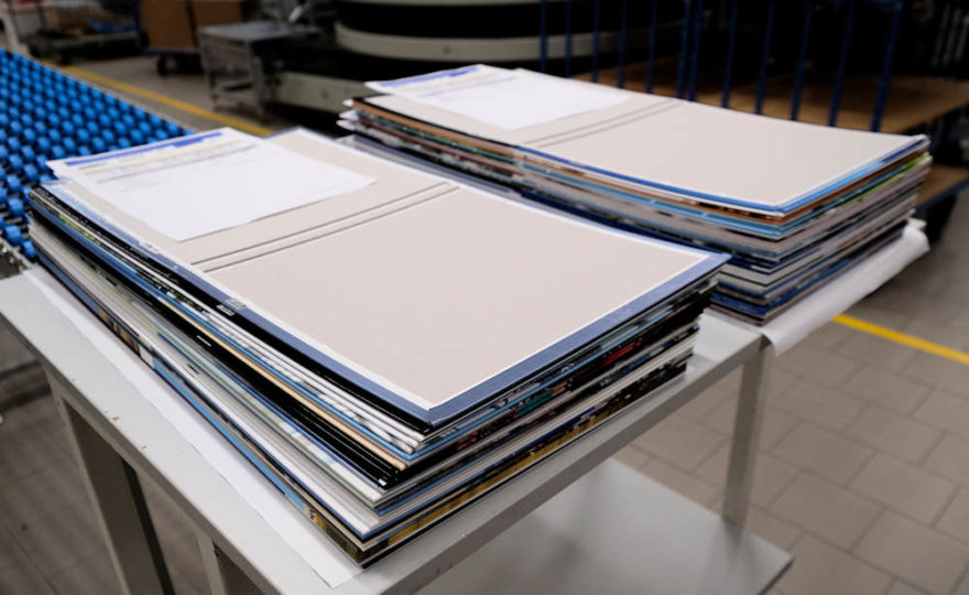 Die fertigen Umschläge warten nun auf die passenden Buchblocks. Nur der Strichcode des Auftrags weiss, welcher Buchblock zu welchem Umschlag gehört. So wird sichergestellt, dass es keine Verwechslungen gibt.