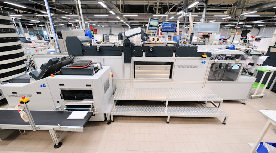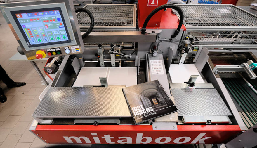 Die entwickelte Rolle kommt anschliessend in eine «Fastblock»-Bindemaschine von Imaging Solutions, die für bis zu 60 Buchblocks pro Stunde ausgelegt ist. Sie schneidet das Rollenpapier in die richtige Bogengrösse, falzt die Bögen und klebt immer zwei Bögen halbseitig gegeneinander. Auf diese Weise entsteht die sogenannte «Layflat»-Bindung. Diese besonders hochwertige Bindung ermöglicht es, das fertige Buch völlig flach aufzuschlagen. Das ist vor allem für Panorama-Fotos von Vorteil, denn so entsteht keinerlei Motiv-Verlust durch den Falz. Anschliessend wird der Buchblock automatisch auf drei Seiten geschnitten. Wie im Prozess mit Digitaldruckpapier werden danach die fertigen Buchblocks mit den passenden Covern «verheiratet».