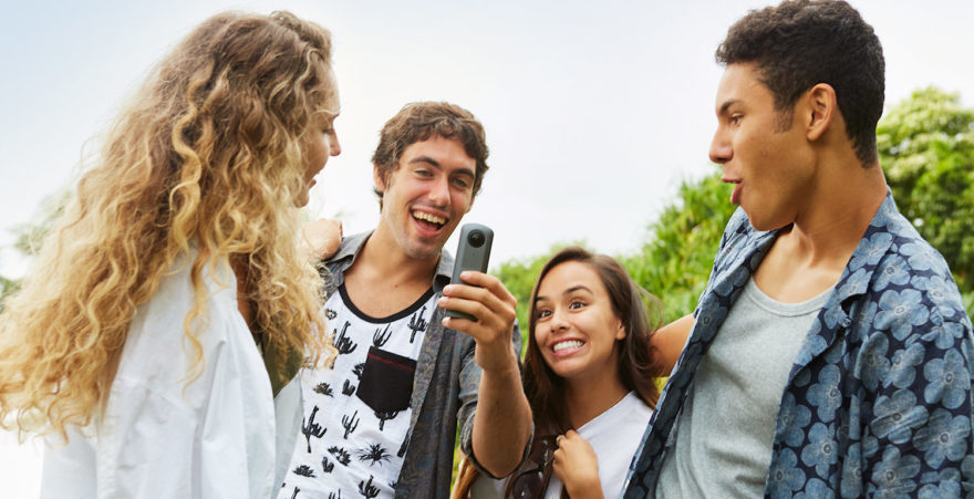 Einfache Handhabung. Die Bedienung der Kamera erfolgt im Prinzip über vier Tasten, drei für Ein- und Ausschalten, die Aufnahmeart und der Auslöser machen Foto- und Videoaufnahmen in 360 Grad, eine weitere Taste dient der Internetverbindung über WLAN. Installierte Apps ermöglichen das Steuern von Kamerafunktionen und die Bildübertragung. So können die Fotos und Videos gleich nach der Aufnahme in den Kanälen der Sozialen Netzwerke geteilt werden – mit der neuen Ricoh Theta V soll dies bis zu 10x schneller gehen als bisher.