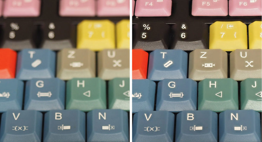 Aufnahme einer Tastatur, in beiden Fällen aufgenommen mit Blende 2,8. Links eine Einzelaufnahme, rechts eines aus mehreren Fotos gestacktes Bild. © Heiner Henninges