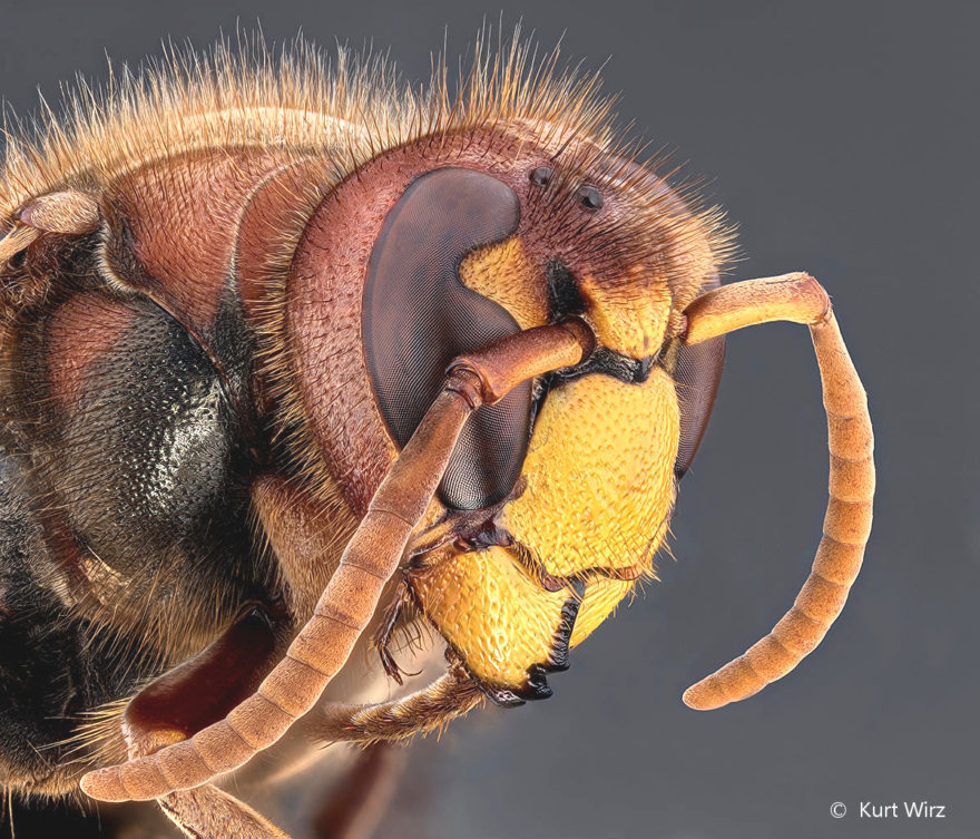 Im Supermakro- bzw. Lupenbereich sind mit Fokus-Stacking Bilder möglich, die weit über die optischen Grenzen hinausgehen. Dieses Bild einer Hornisse wurde mit einer Nikon D810 und einem Rodenstock APO-Rodagon N 2.8/50mm in Retrostellung im Abbildungsmassstab 2:1 mit 144 Einzelaufnahmen im Abstand von 0.06mm aufgenommen und danach gestackt. Quelle: Kurt Wirz / www.focus-stacking.com