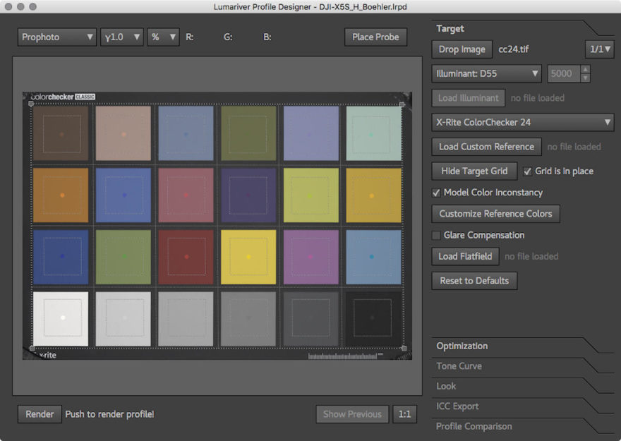 Basieren diese Änderungen auf einer generellen Unzulänglichkeit des bestehenden generischen Profils (z.B. Brauntöne zu rot o.ä.), lassen sich diese in ein neues ICC-Kameraprofil einrechnen. Dieses neue Kameraprofil kann nun auch als Standardprofil verwendet werden.