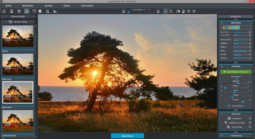 Jedes Foto, das im Programm geöffnet wird, bekommt automatisch eine Bewertung im Rahmen von fünf Sternen. Zur Analyse zieht Easy Foto objektive Bewertungskriterien wie Helligkeit, Brillanz, Schärfe, Farbechtheit, Details und Rauschen heran. Der Nutzer kann jedes Foto durch «automatisches Verbessern», also eine Anpassung dieser technischen Parameter, optimieren.