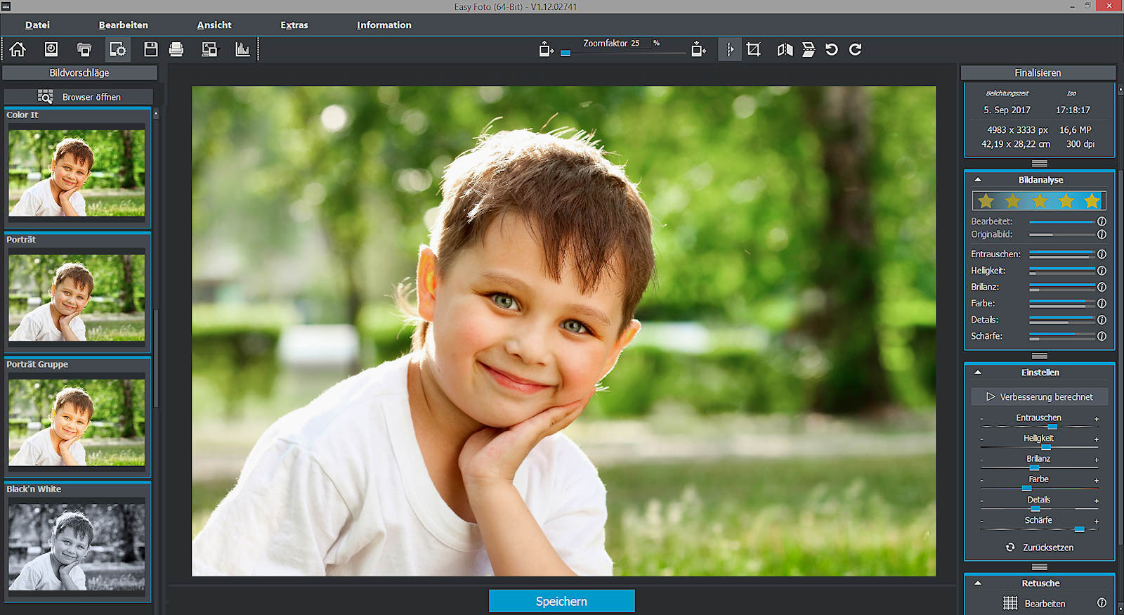 Jedes Foto, das im Programm geöffnet wird, bekommt automatisch eine Bewertung im Rahmen von fünf Sternen. Zur Analyse zieht Easy Foto objektive Bewertungskriterien wie Helligkeit, Brillanz, Schärfe, Farbechtheit, Details und Rauschen heran. Der Nutzer kann jedes Foto durch «automatisches Verbessern», also eine Anpassung dieser technischen Parameter, optimieren.