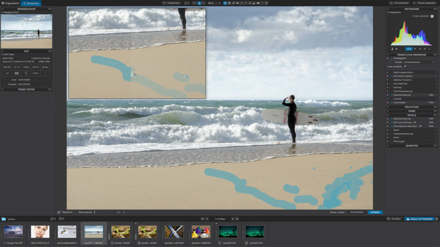 DxO PhotoLab bietet ein vollständig überarbeitetes Reparaturwerkzeug. Die Oberfläche besticht nach wir vor durch Einfachheit: ein simpler Pinsel, der in den zu korrigierenden Bereichen angewendet wird. Doch der zugrunde liegende Algorithmus liefert ein wesentlich besseres Ergebnis und arbeitet deutlich schneller. Dieses überarbeitete Reparaturwerkzeug wird so zu einem echten Korrekturwerkzeug, mit dem ganz einfach und schnell unerwünschte Elemente in den Fotos entfernt werden können.