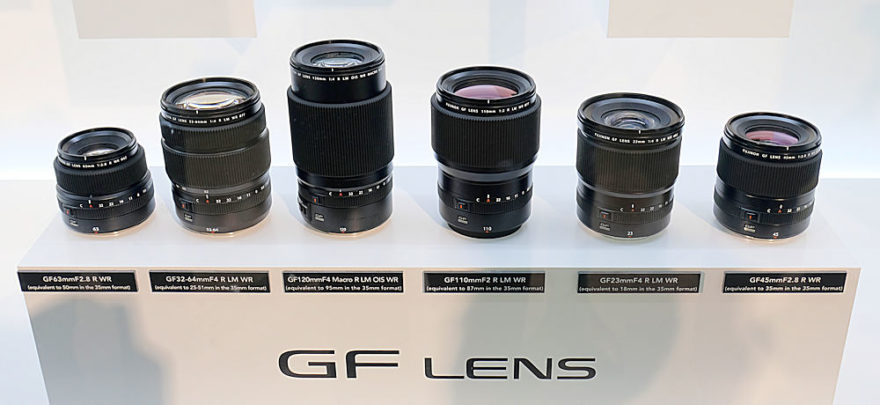 Alle sechs «Fujinon GF»-Objektive für die Fujfifilm GFX 50s, wie sie aktuell (Ende 2017) erhältlich sind.