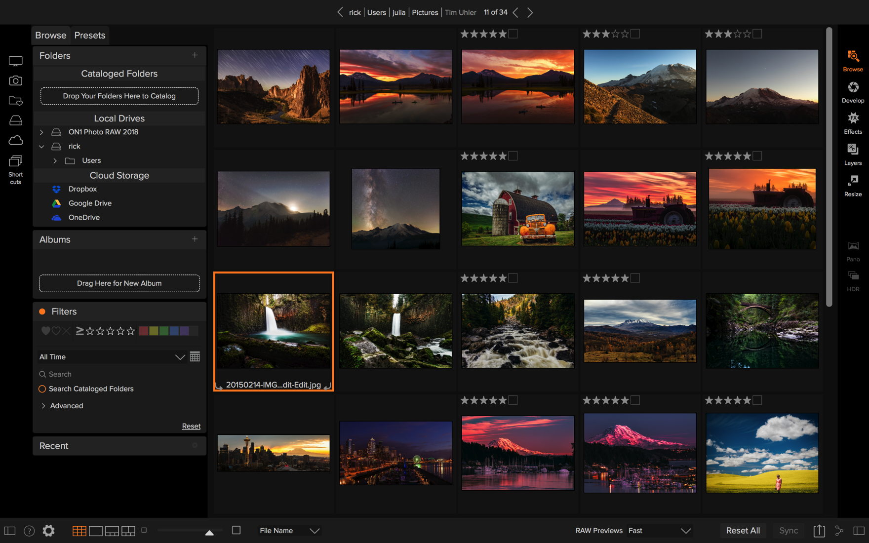 ON1 Photo RAW 2018 unterscheidet sich von anderen Pogrammen dadurch, dass Fotografen ihre Fotos von Anfang an durchsuchen und katalogisieren können. Der schnelle Foto-Browser eignet sich zum raschen Sichten und Aussortieren von Fotos, ohne erst auf den Import in einen Katalog warten zu müssen. Wenn dieser erste Schritt abgeschlossen ist, können die Fotos (bei Bedarf) katalogisiert werden. Dieses Hybridsystem ist eines der schnellsten «Digital Asset Management»-Werkzeuge, das heute verfügbar ist.