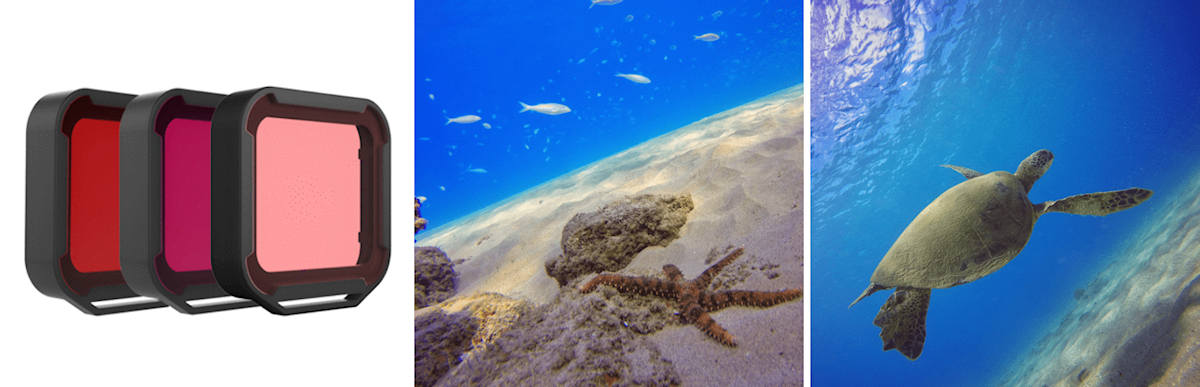 Filtersatz für Unterwasseraufnahmen für GoPro Hero 6 / Hero 5. Sie reduzieren den Blauanteil unter Wasser und ergeben natürliche Farben. Drei verschieden starke Filter für verschiedene Tauchtiefen. Bestellnummer 521767, Preis: CHF 69.00 (UVP inkl. Mwst)