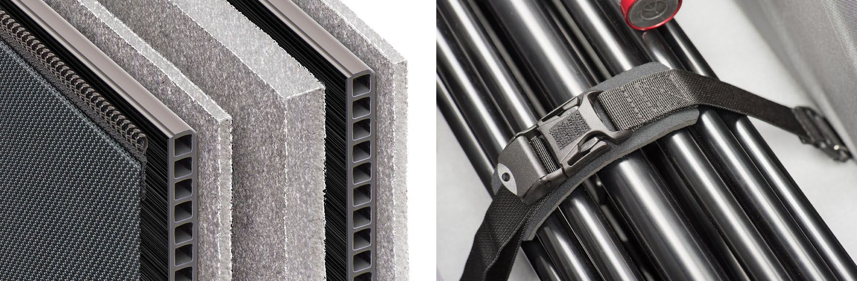 Eine mehrschichtig verstärkte Wand (links) schützt den Inhalt des Rollkoffers. Integrierte Gurte (rechts) fixieren das Stativ im Koffer.