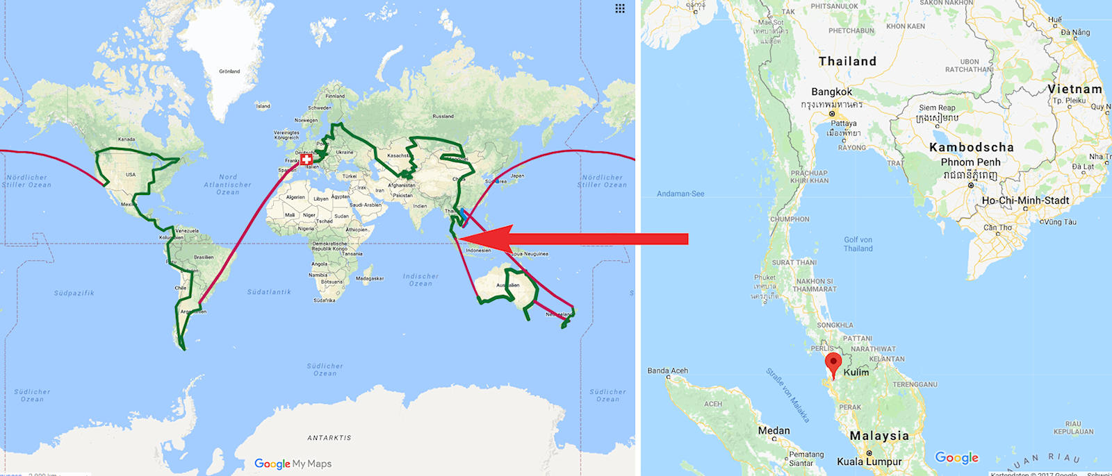 Nach 253 Tagen haben wir das 23. Land auf unserer Reise erreicht, Malaysia. Uns geht es sehr gut, gesundheitlich hatten wir kaum Probleme und an den Reisealltag haben wir uns gut gewöhnt. Allerdings sind wir nicht mehr ganz so flott unterwegs wie am Anfang und sehnen uns zwischendurch nach einer kleinen Oase, wo wir ein paar Tage verweilen können.