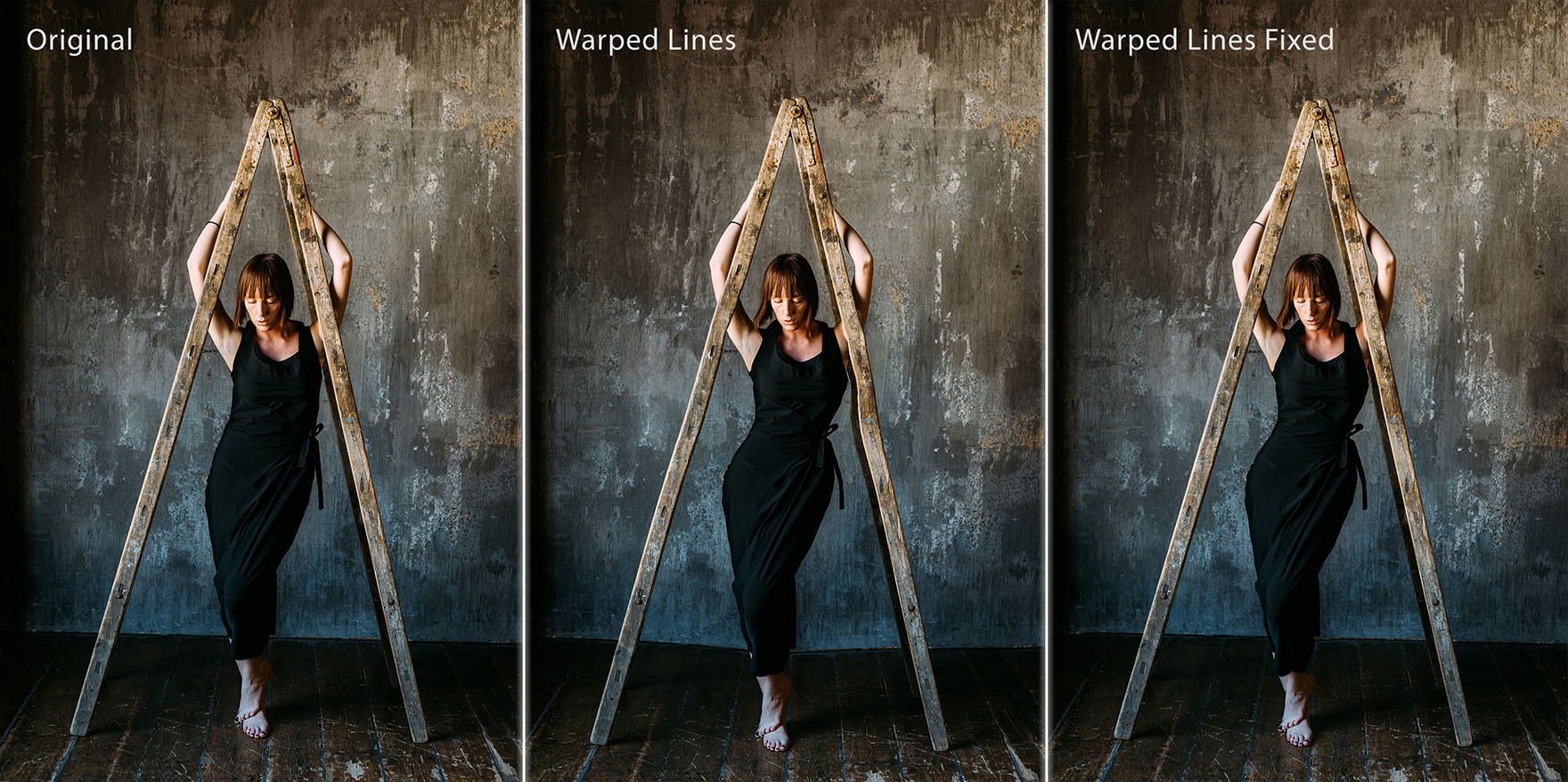 Der neue Warp Fixer in PortaitPro Body 2.0 verhindert ungewollt verzerrte Bildbereiche. Seine Wirkung zeigt das Bild ganz rechts im Vergleich zum veränderten Bild in der Mitte, das mit der Verzerrung der Leiter in der Höhe der Taille des Modells die Bildmanipulation verrät.