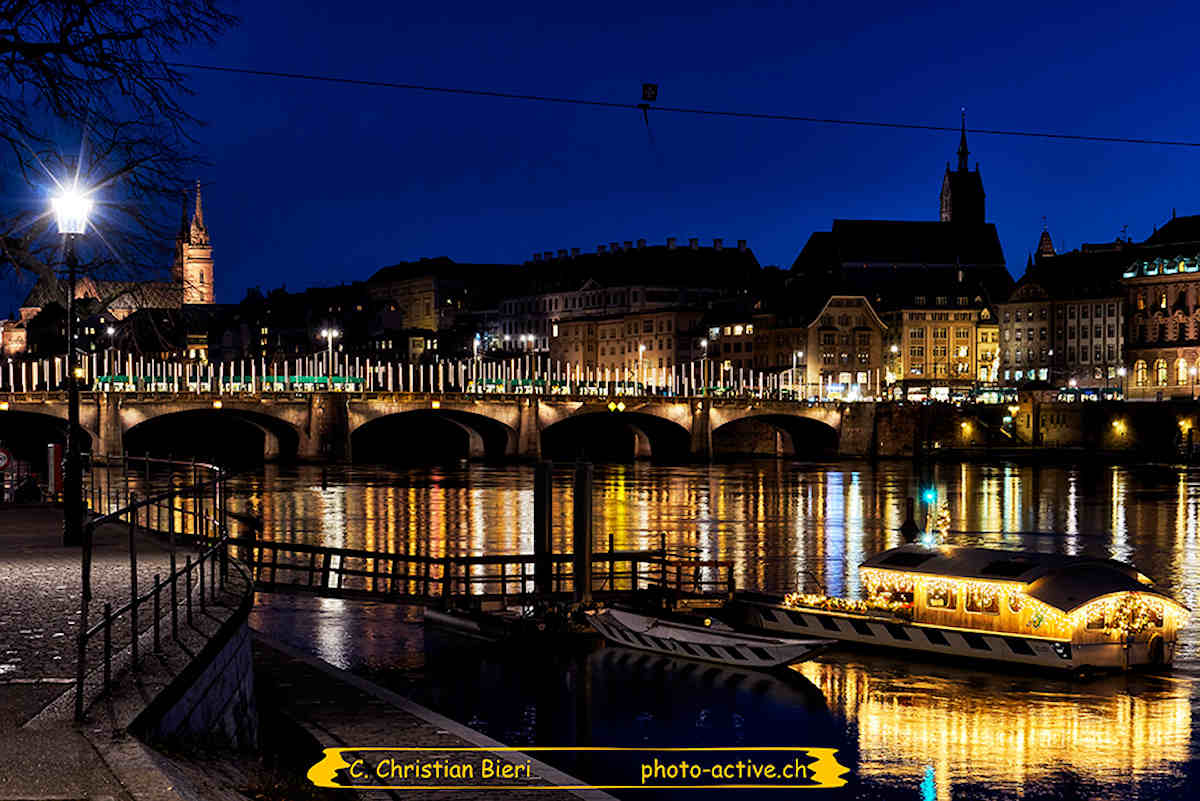 Basel ist stolz auf seine Rheinfähren, die sich in der Weihnachtszeit festlich schmücken, gesehen und gekonnt fotografiert von Christian Bieri