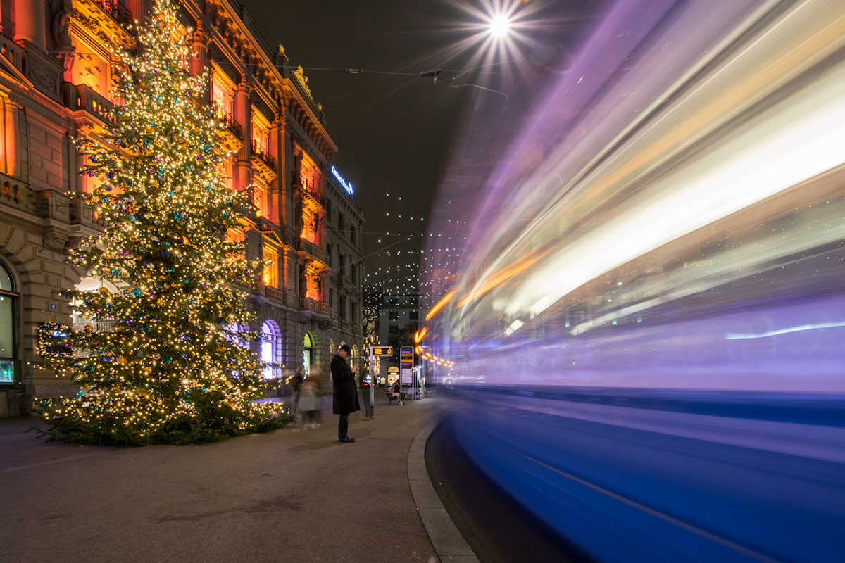 … und in Zürich flitzt das Tram am grossen Weihnachtsbaum vorbei und symbolisiert die vorweihnachtliche Hektik – realisiert von Ralf Turtschi.
