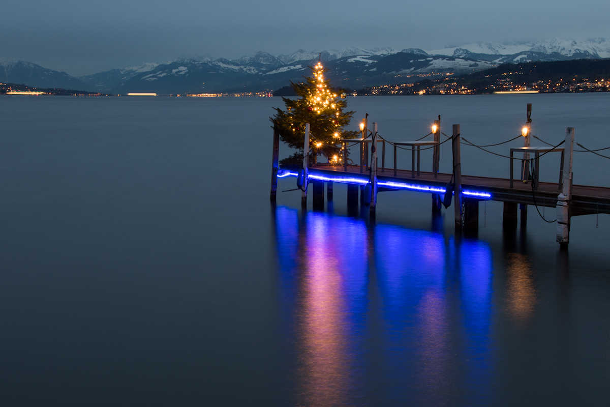 Friedliche Ruhe kehrt ein und überall gehen die Lichter an – auch am einsamen Weihnachtsbaum auf dem Schiffssteg, der Ralf Turtschi als Motiv diente.