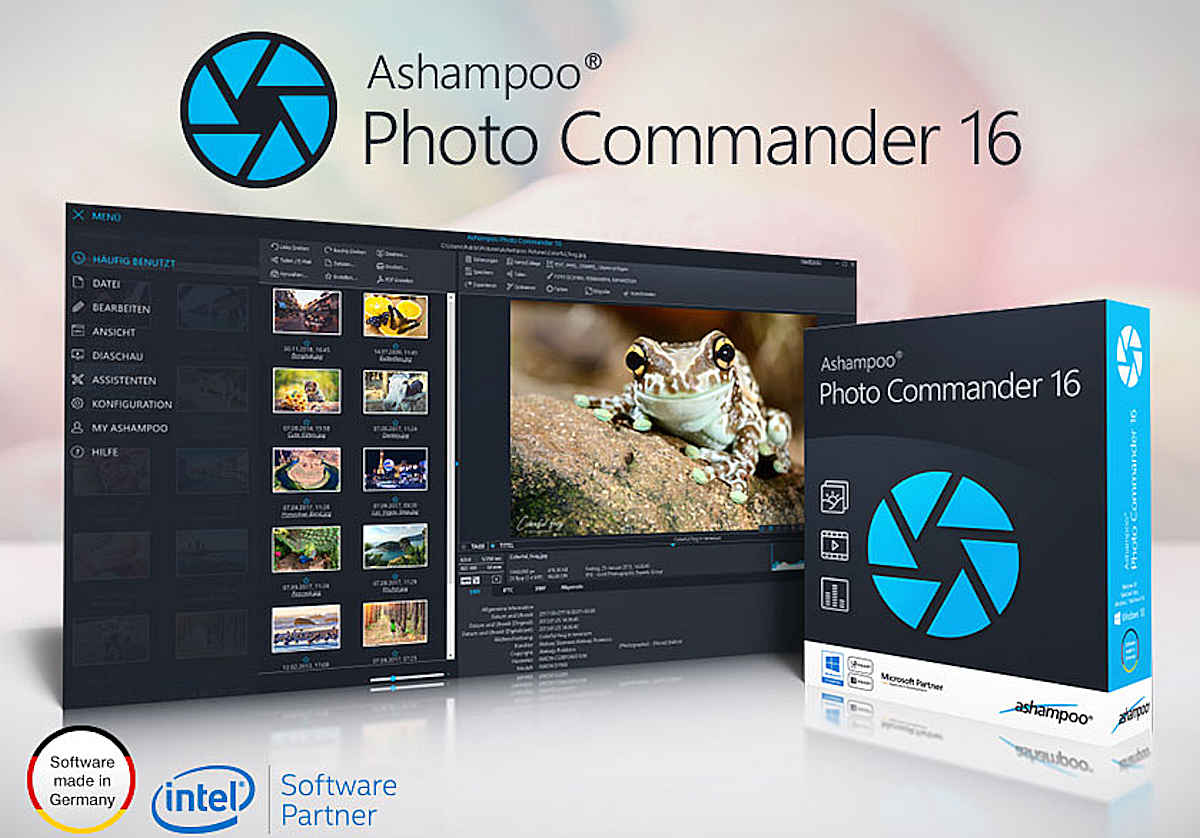 Der neue Ashampoo Photo Commander 16 ist die Komplettlösung zum Betrachten, Bearbeiten und Organisieren von Fotos. Bringen Sie neue Ordnung in Ihre Sammlung, lassen Sie beliebig viele Bilder gleichzeitig optimieren oder gestalten Sie Kalender, Karten und ganze Diashows im Handumdrehen. Optimieren Sie Ihe Fotos mit einfachen aber effizienten Tools, korrigieren Sie Farbstiche, machen Sie Ausschnitte oder anspruchsvolle Bildcollagen. Mit nur wenigen Klicks kommen sowohl Einsteiger als auch Hobbyfotografen und sogar Profis schnell zum Ziel. Mit dem Ashampoo Photo Commander 16 werden Ihre Fotos zu Bildern.