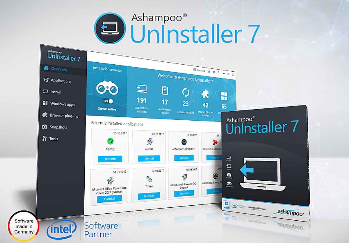 Mit dem Ashampoo UnInstaller 7 können Sie unbesorgt Programme installieren, testen und deinstallieren. Ungewollte Software, Browser-Erweiterungen und Toolbars fegt der UnInstaller mit einem Mausklick komplett von der Festplatte! Nie zuvor wurden Installationen so umfassend überwacht, damit sie bequem und ohne Rückstände deinstalliert werden können. Selbst Programme ohne Protokollierung, die vielleicht schon lange auf dem Rechner sind, werden durch die Tiefenreinigung ohne Rückstände beseitigt! Und durch die innovative Snapshot-Technik sehen Sie jede Veränderung, die auf Ihrem Rechner stattgefunden hat – blitzschnell und übersichtlich.
