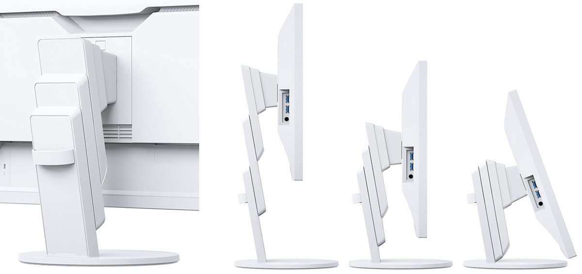 Der Vorteil des ultraschmalen Rahmens von nur einem Millimeter zeigt sich besonders bei der Verwendung mehrerer Monitore, die zusammen eine fast nahtlose Sichtfläche ergeben. Mit dem ergonomischen Standfuss lässt sich der Bildschirm neigen, schwenken und um 90° ins Porträt-Format drehen. Zudem ist dieses Modell beinahe bis zur Tischkante justierbar und kann um bis zu 177 mm in der Höhe verstellt werden. Mit einer PCSK-03 Halterung kann ein Mini-PC oder Thin Client einfach und platzsparend an der Rückseite des Monitors montiert werden. Der EV2785W verfügt über Frontlautsprecher, die in den schmalen Rahmen eingefügt sind.
