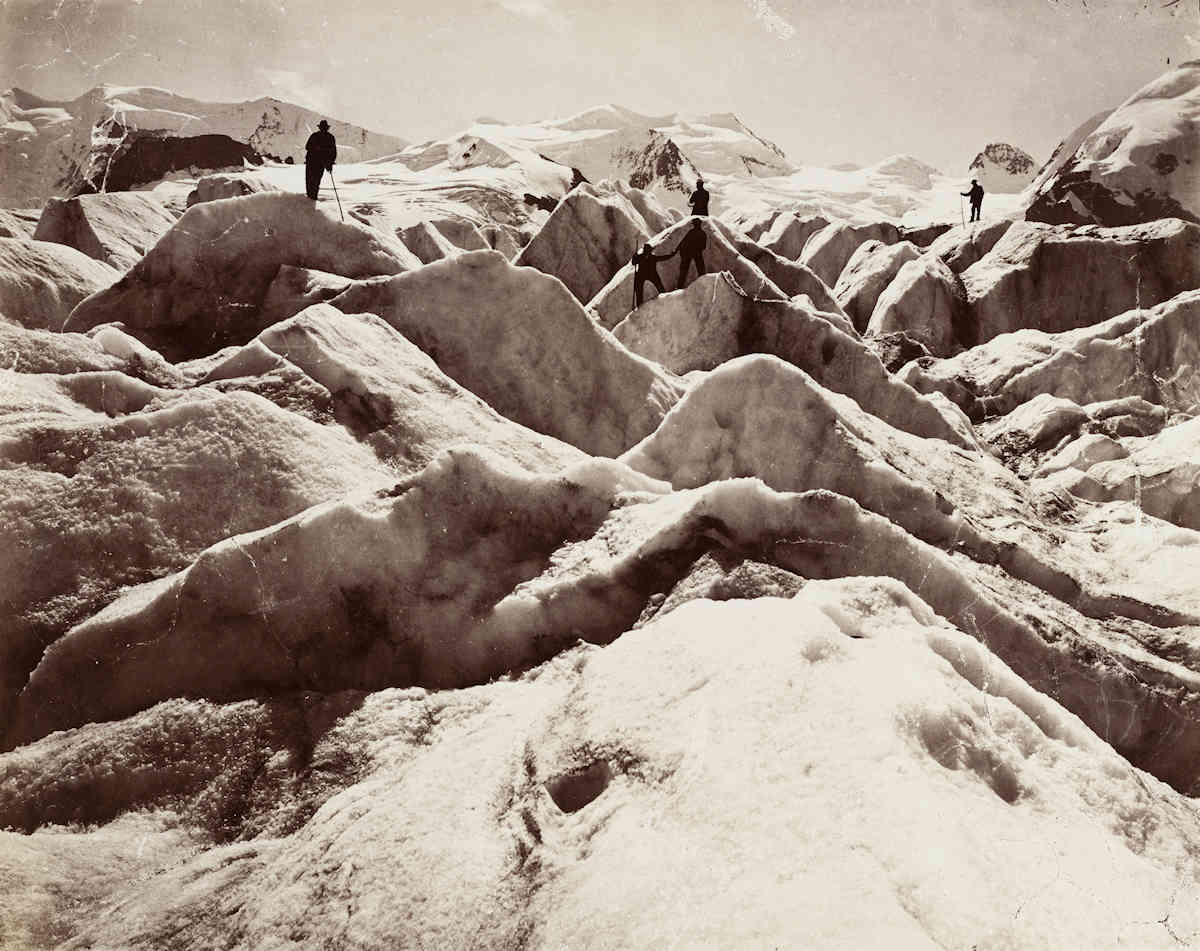 Adolphe Braun, «Alpinisten auf dem Morteratsch-Gletscher», 1875, Albuminprnt. Adolphe Braun wurde mit solchen Fotos aus den Schweizer Alpen berühmt.