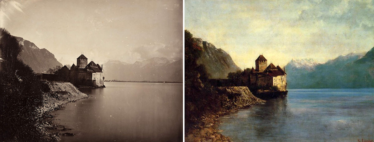 Adolphe Braun «Cháteau de Chillon, Lac de Genève», um 1870 (links). Die Fotografie diente Gustave Courbet als Vorlage für das berühmte Gemälde des Schlosses.