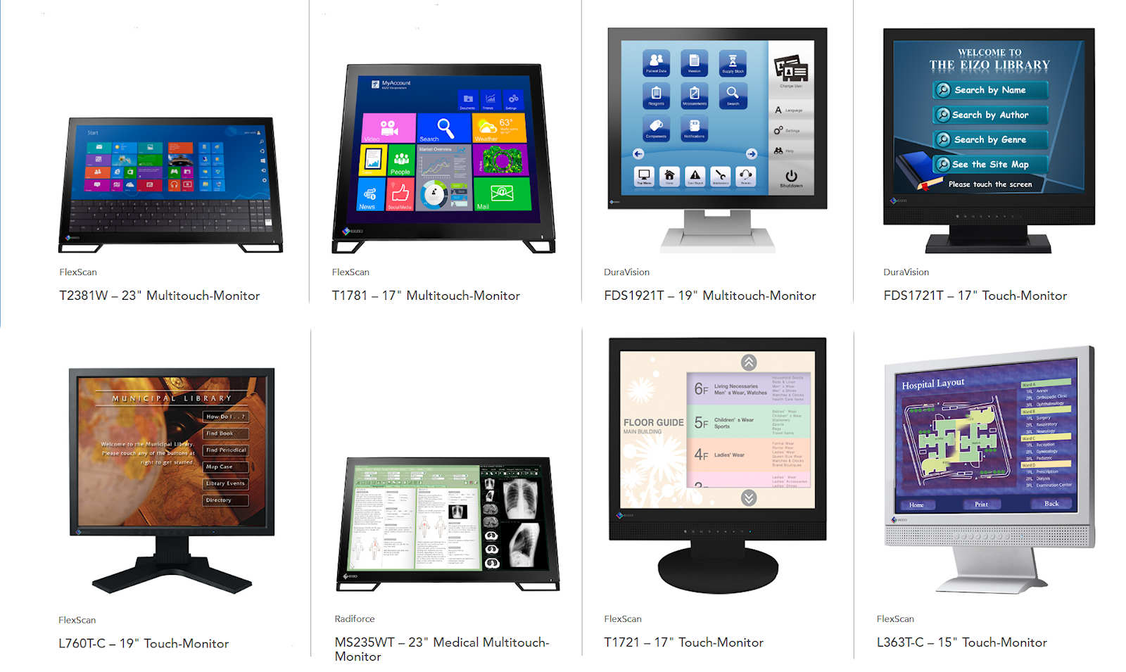Die Touchscreen-Modelle sind für verschiedenste Anwendungen gedacht, z.B. für den Verkaufspunkt, für den Office-Bereich, aber auch für den Industrie- und Reinraumeinsatz. Sie sind auf die Single- oder Multitouch-Bedienung mit Finger, Handschuh oder Stift ausgelegt. Zudem sind sie kratzfest und temperaturbeständig sowie für die VESA-Montage geeignet oder sie können mit dem Standfuss benutzt werden.