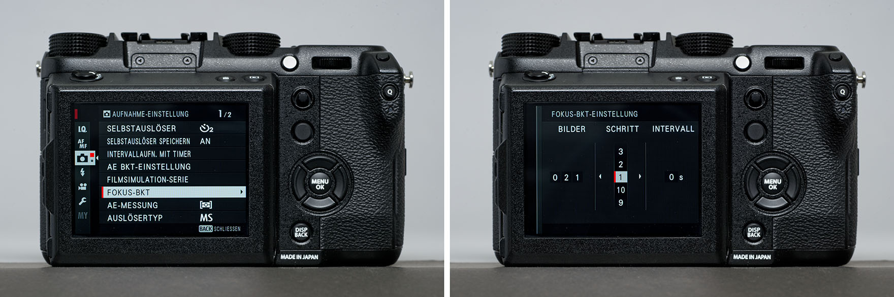 In der Kamera lassen sich jetzt die Zahl der Aufnahmen (bis 999) und die Grösse der Fokusschritte in Werten von 1 bis 10 bestimmen. Ebenfalls lässt sich ein Intervall festlegen.