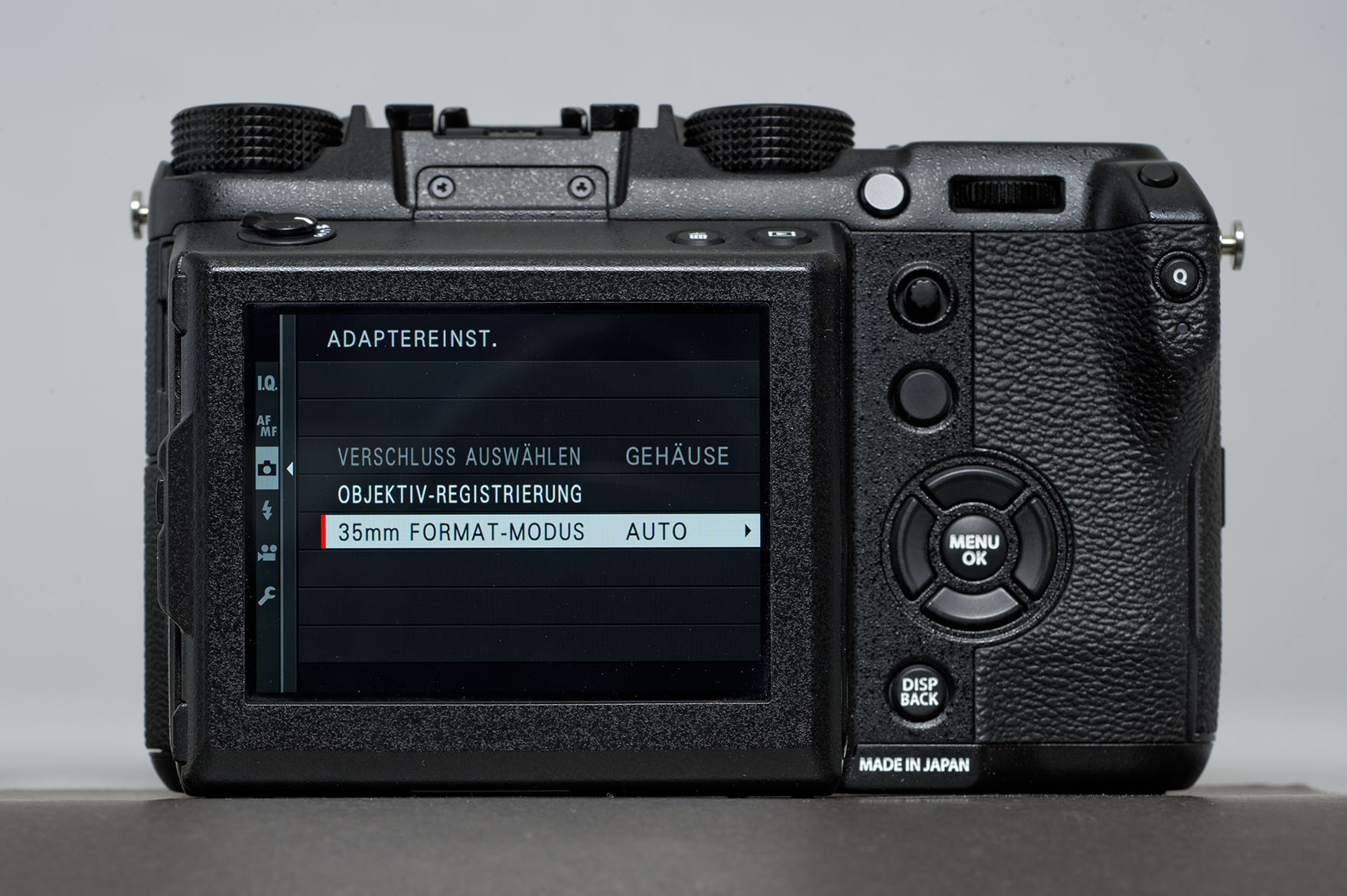 Nach dem Update: Wird ein Objektivadapter anstelle eines Fujinon-Objektivs montiert, so kann im Register «Aufnahme» unter Adaptereinstellungen der «35mm Format-Modus» aktiviert werden. Dann wird nur ein entsprechender Teilbereich des Sensors im Format 36.0mm x 24.0mm (30.5 Mpx) ausgelesen und als JPEG und/oder als RAF-Raw gespeichert. Im Videomodus bleibt der «35mm Format-Modus» übrigens stets deaktiviert.