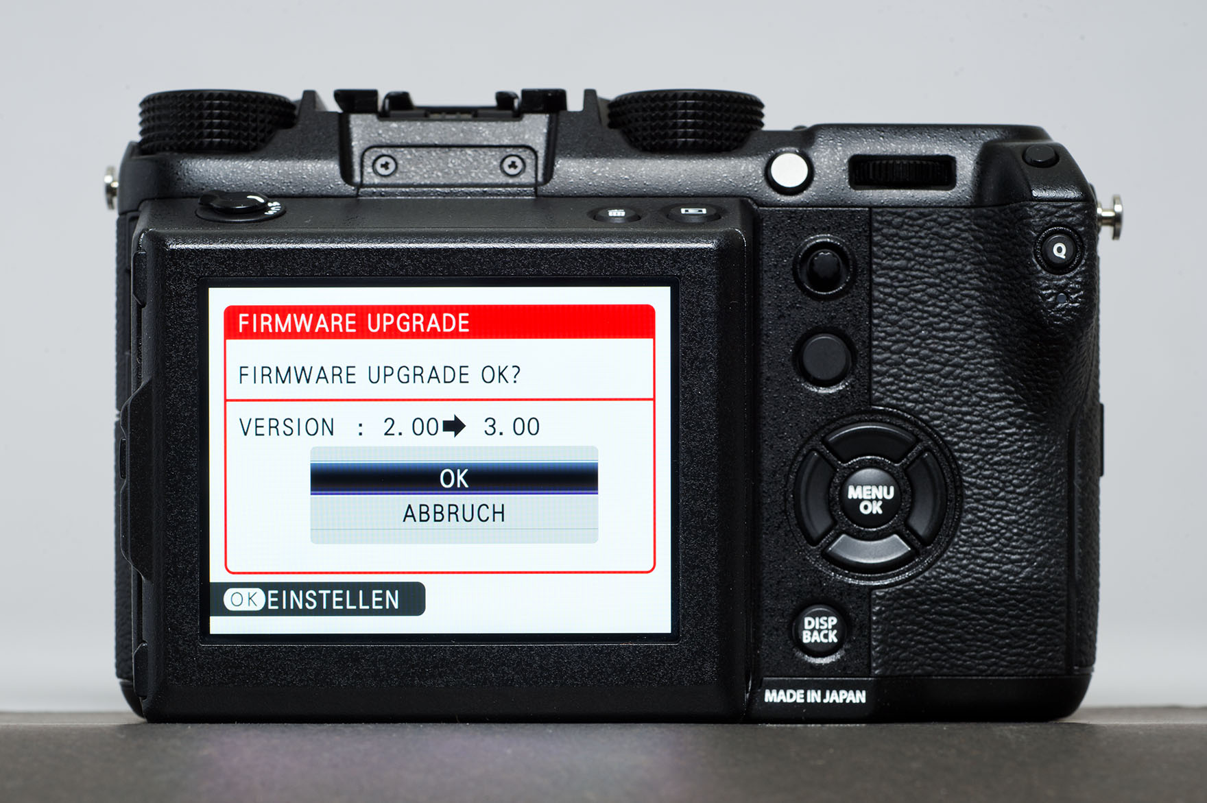 Hat man das herunter geladene Firmware-Update auf eine SD-Karte kopiert und die Karte in der Kamera einglegt, muss man beim Einschalten der Kamera die DISP-Taste gedrückt halten. Dann wird die aktuelle Firmware angezeigt und man kann das Update auslösen.
