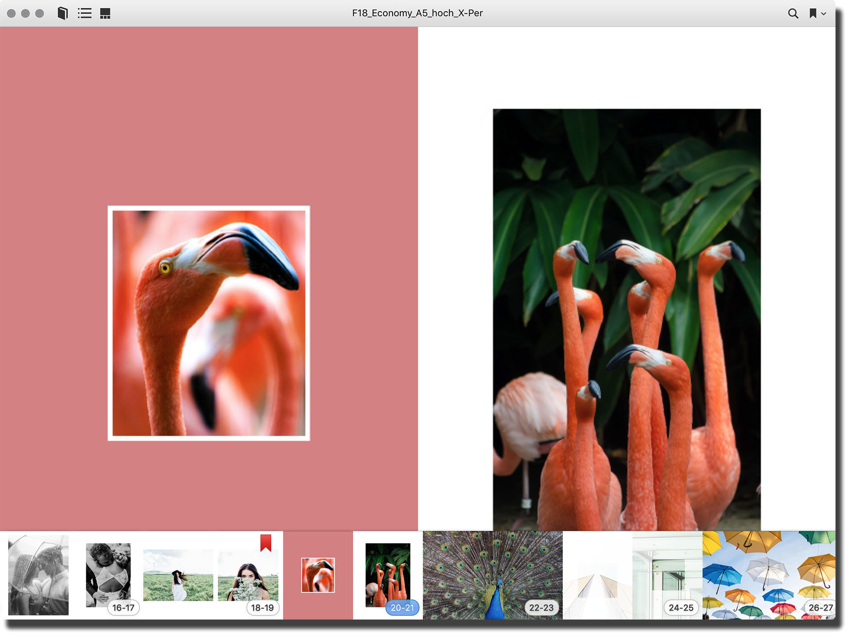 Screenshot der E-Book-Doppelseite eines Fotobuchs mit eingeblendeter Übersicht auf weitere Seiten. (Unter Mac OS X / macOS können E-Books z.B. mit iBooks angeschaut werden.