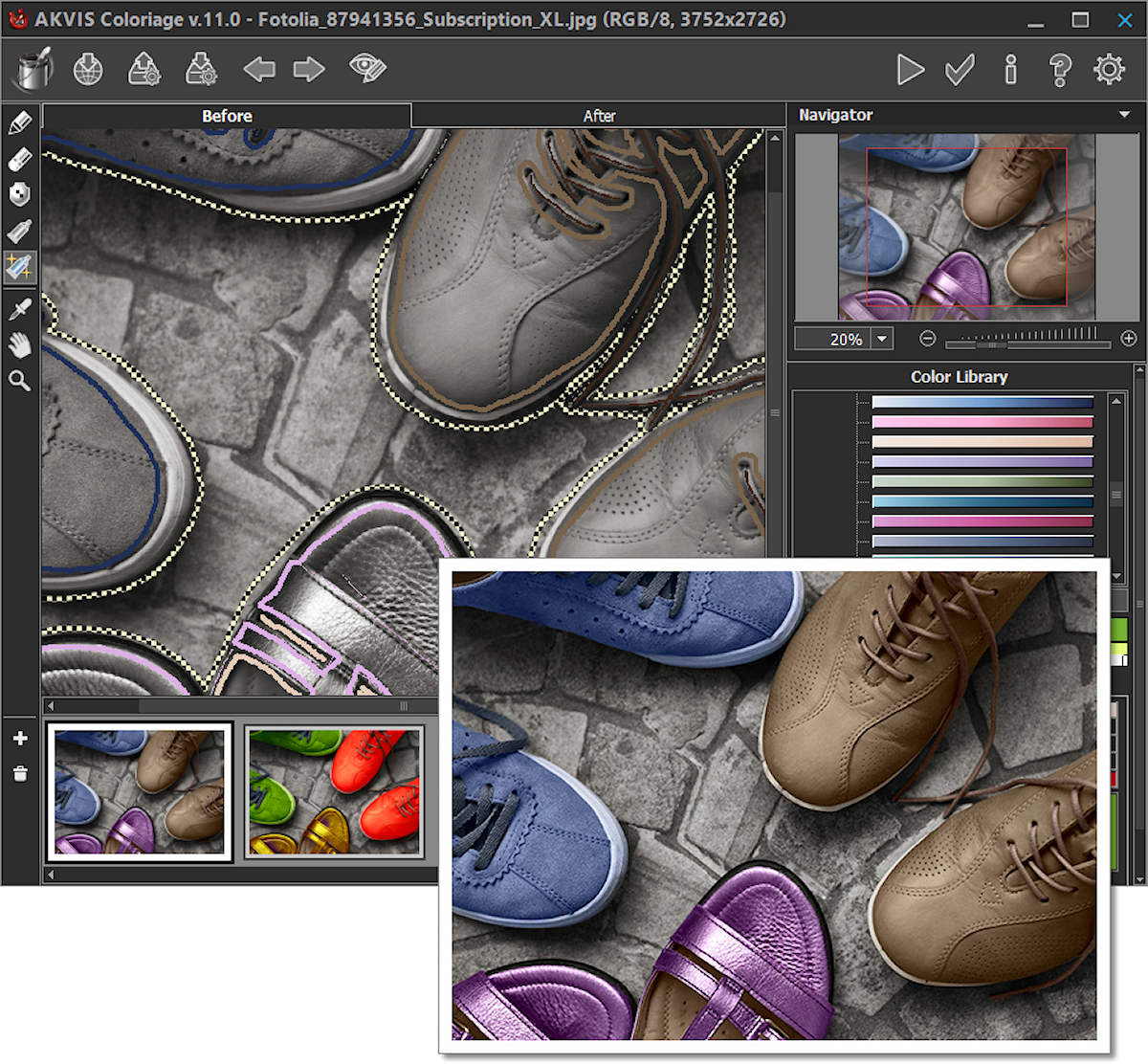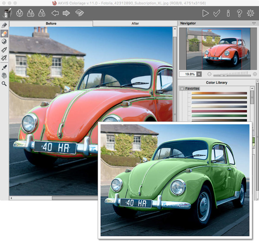 Akvis Coloriage Version 11 ermöglicht das Einfärben von Schwarzweiss-Fotos und das Ersetzen von Farben in Farbfotos und bietet die neue Favoriten-Kategorie in der Farbbibliothek, das Protokollpinsel-Werkzeug, Unterstützung für RAW- und PSD-Dateien in der Standalone-Version, einige Schnittstellenverbesserungen sowie weitere Änderungen.