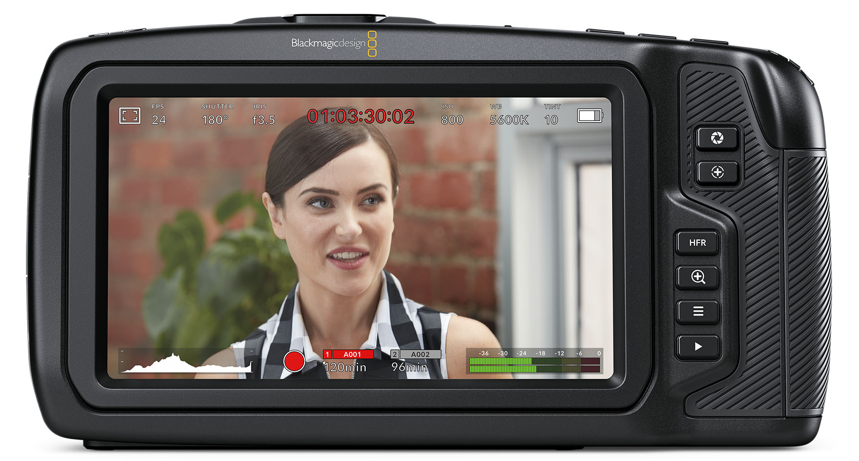 Auf der Rückseite der Kamera befindet sich ein heller, grosser 5-Zoll-Touchscreen, der die Bildausschnittswahl und präzise Scharfstellung erleichtert. Die Kamera verwendet dasselbe Blackmagic OS wie die URSA Mini und ermöglicht so die Justierung von Einstellungen, das Hinzufügen von Metadaten und die Ansicht des Aufzeichnungsstatus mithilfe von einfachen Tipp- und Wischgesten. Anhand von Bildschirm-Overlays hat man Aufzeichnungsparameter, Status, Histogramme, Focus- und Peaking-Indikatoren sowie Transporttasten schnell im Blick. Zudem stehen 3D-LUTs für das Monitoring und die Aufzeichnung zur Verfügung.