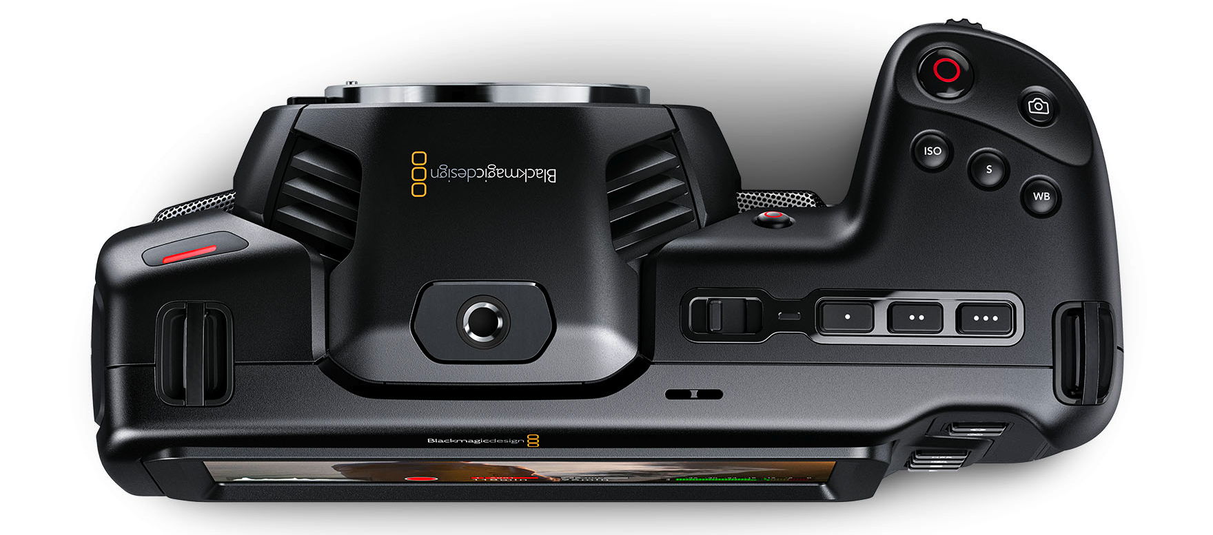 Als reine Cinema-Kamera verzichtet die Pocket auf Blitz und Blitzschuh. Anstelle von letzterem bietet sie ein Schraubgewinde, das für ausladendes Zubehör besseren Halt bietet.