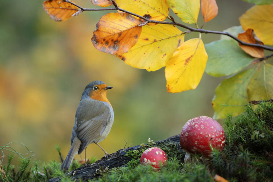 Folkert Christoffers mit «Rotkehlchen» (2017, 1. Platz Kategorie «Allgemein»): Dieses Rotkehlchen habe ich auf einem Waldspaziergang fotografiert. Die Szene gefiel mir, da die Farben des Vogels sehr schön zu den Blättern, dem Moos und den Pilzen passen.