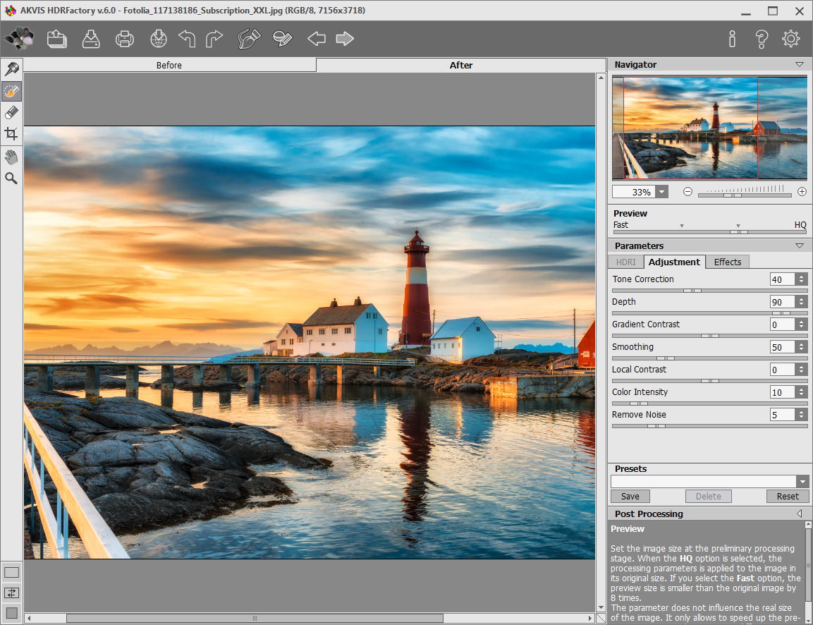 Dabei ist es einerseits möglich, einen realistischen Effekt zu erzielen, um die Gesamtqualität des Bildes zu verbessern und ein natürlich wirkendes Bild mit differenzierter Zeichnung selbst in dunkelsten und hellsten Bildbereichen zu erzeugen. Andererseits kann das Bild durch Betonung von Helligkeitsunterschieden dramatischer gestaltetet werden (HDR als Effekt).