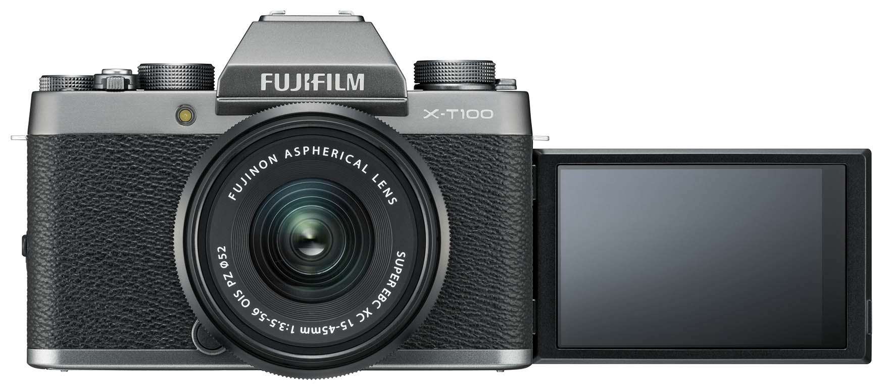 Der rückwärtige Touchscreen der X-T100 lässt sich in drei Richtungen drehen und erleichtert so das Fotografieren und Filmen aus ungewöhnlichen Perspektiven. Er lässt sich ebenfalls nach vorne richten, damit kontrollierte Foto- und Videio-Selfies möglich sind. Der elektronische Sucher bietet eine hohe Auflösung und eine 0,62-fache Vergrösserung, sodass der Nutzer das Motiv auch bei hellem Umgebungslicht sehr komfortabel betrachten kann.