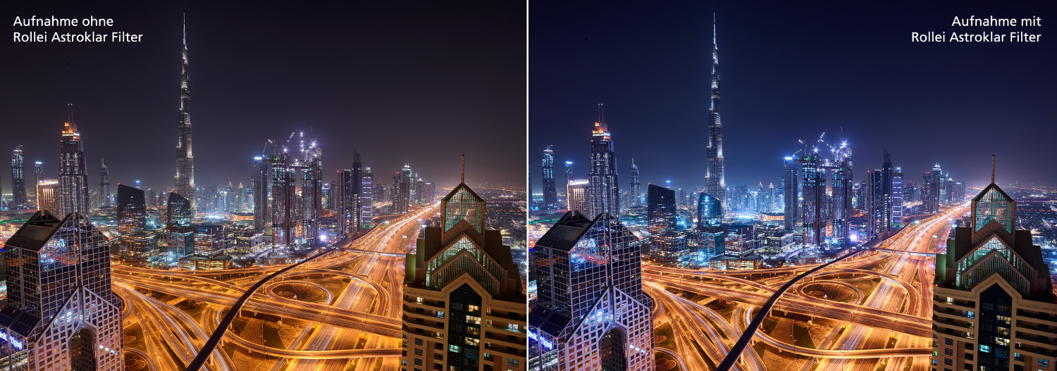 Rollei Astroklar Vergleichsbild: Die neuen Rollei Astroklar Filter verbannen Lichtschmutz aus Nachtaufnahmen und sorgen für mehr Details und Strukturen in Aufnahmen in der Dunkelheit.