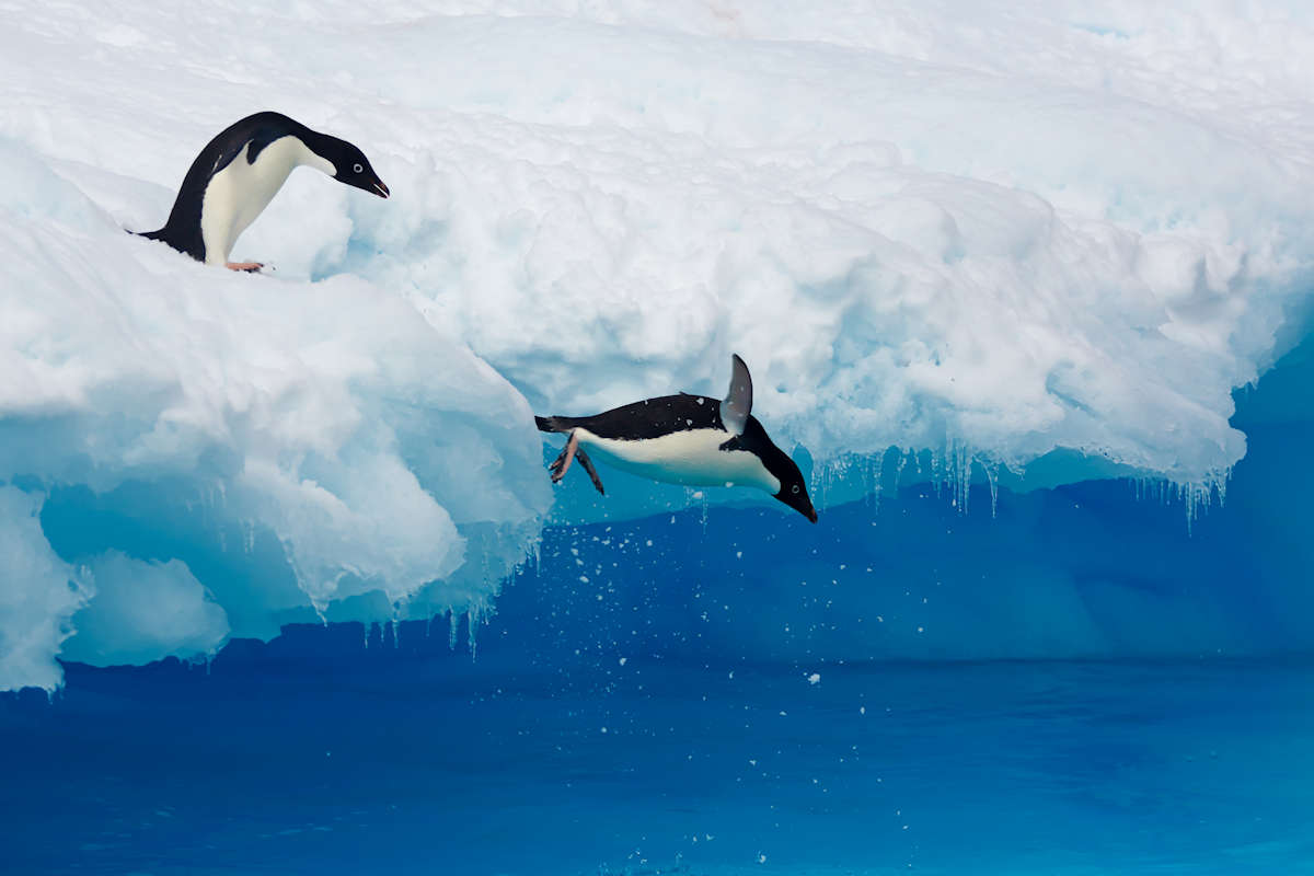 «Jump! Das ist eines meiner Lieblingsfotos. Es ist eine ‚Single Shooting‘ Aufnahme. Der Zeitpunkt war perfekt und man sieht schön, wie sich Eisteile unter den Füssen des Adelie Pinguins loslösen. Die Aufnahme entstand aus einem Zodiak Gummiboot heraus mit einem Teleobjektiv und einer Distanz von ca. 20 Metern.»