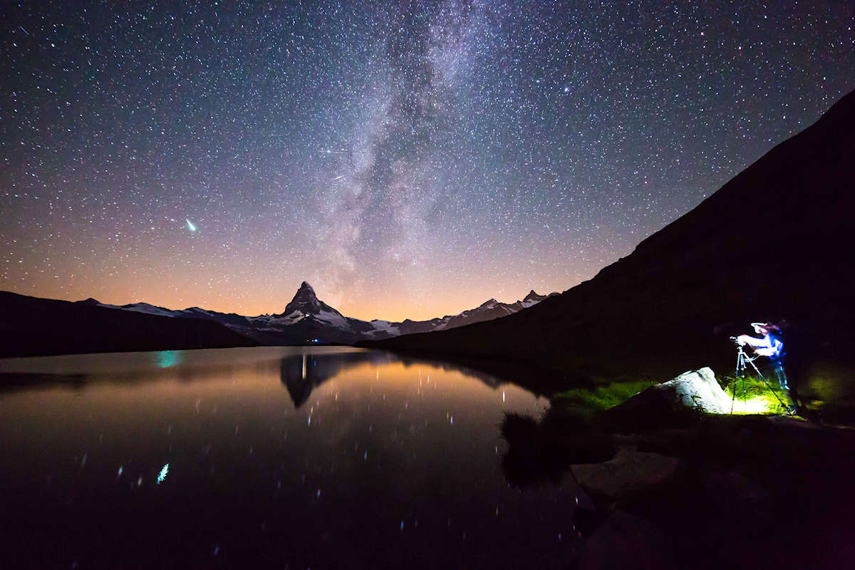 «Eine prachtvolle Stimmung rund ums Matterhorn mit einem fantastischen Sternenhimmel. Ein besonderer Glücksfall ist es auf einer solchen Aufnahme gleich noch einige Sternschnuppen zu erwischen.»