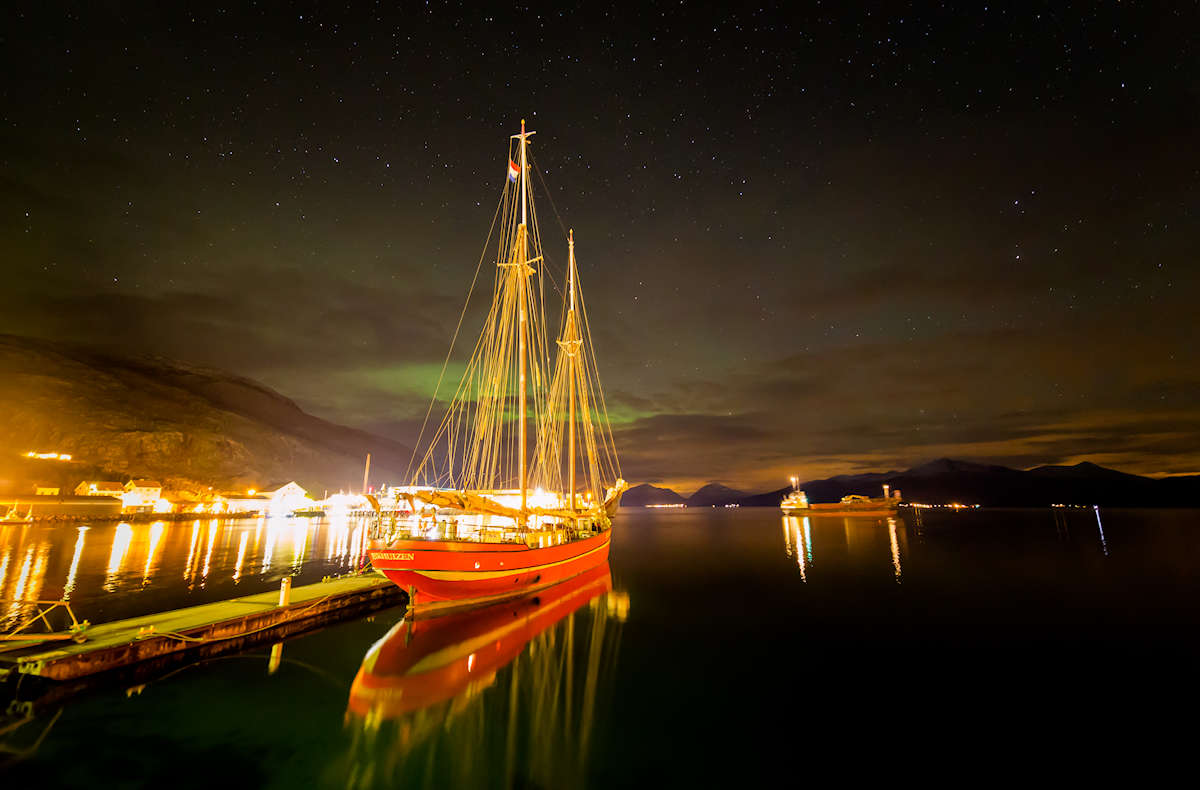 «Das ist das Segelschiff ‚Noorderlicht‘ mit welchem ich eine Woche lang eine Reise durch die Lofoten für eine Reiseunternehmung dokumentiert habe. Mit nur 20 Passagieren, Segel selber hissen und nach Nordlichter Ausschau halten, war es ein tolles Erlebnis. Im Hintergrund sieht man schwach die Nordlichter.»