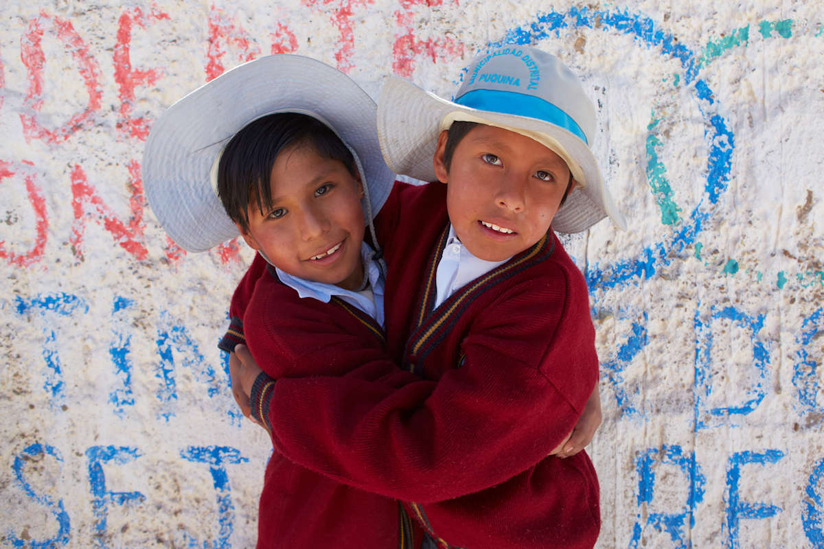«’Best friends forever‘ Peruanische Schulkinder, welche auf dem Altiplano auf über 3500m über mehr leben. Die Luft ist dünn und man bekommt schnell Kopfweh. Sie scheinen das aber ganz locker zu nehmen.»