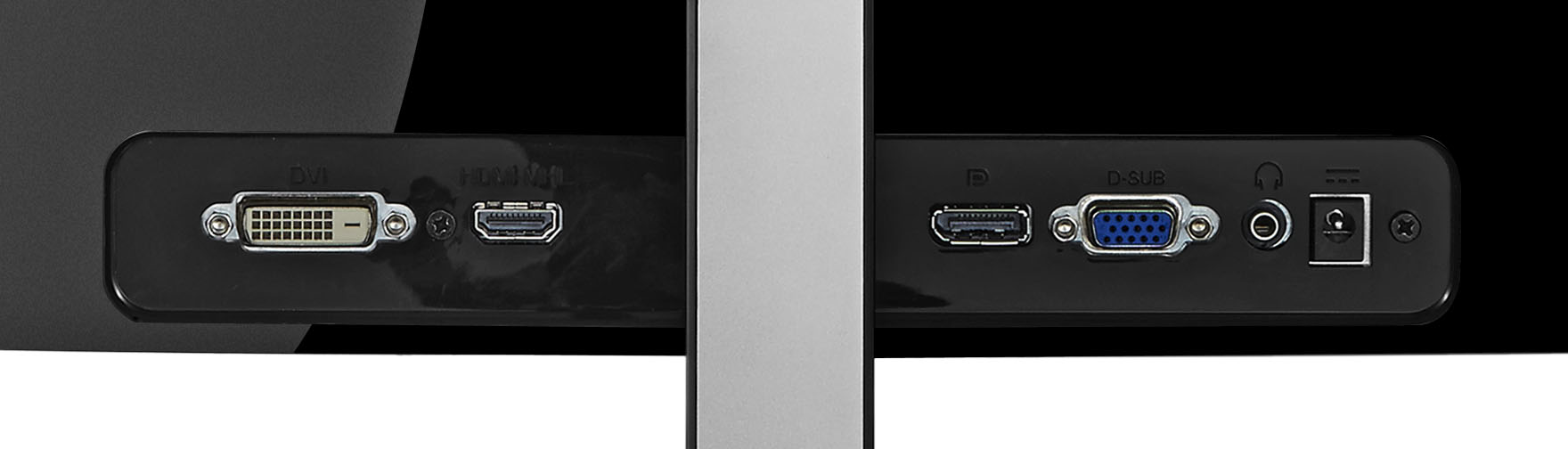 Zeitgemässe Ausstattung an vielfältigen Anschlüssen: VGA- und Von DVI über HDMI und DisplayPort bis hin zum klassischen VGA-Anschluss