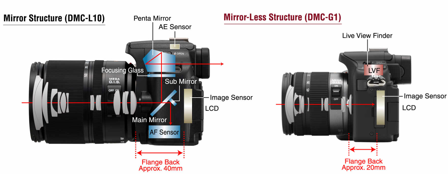 Schematische Darstellung des Vergleichs zwischen einer Spiegelreflex (links) und einer spiegellosen kompakten Systemkamera (rechts). Die Grafik von 2008 illustriert den Unterschied am Beispiel der FourThirds-DLSR Panasonic L10 gegenüber der damals brandneuen Micro-FourThirds-CSC Panasonic Lumix G1. Zu jener Zeit stand die Kompaktheit im Vordergrund, heute brillieren Spiegellose durch ihre fortschrittliche Ausstattung und Funktionalität.