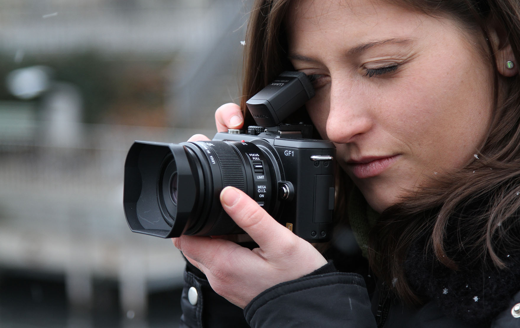 Panasonic Lumix GF1 im Kompaktkameraformat und hier mit optionalem aufsteckbaren EVF. Wem eine Spiegelreflex zu gross, zu sperrig und zu schwer war, interessierte sich früh für eine CSC. (Modellfoto: Markus Zitt)
