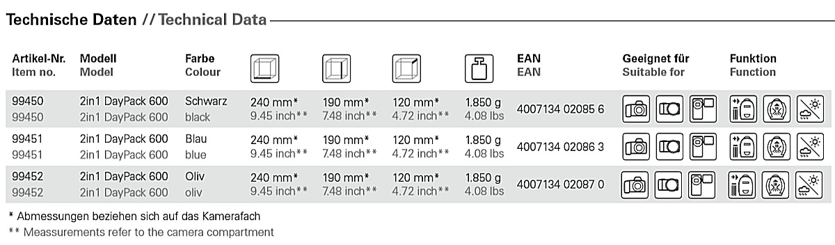Der Ultralight 2in1 DayPack 600+ bietet ein geräumige Kamerafach eignet sich für grosse DSLR-Kameras oder Camcorder und hat noch Platz für Zubehörteile. Ausserdem gibt es noch ausreichend Platz für Kleider und persönliche Gegenstände.