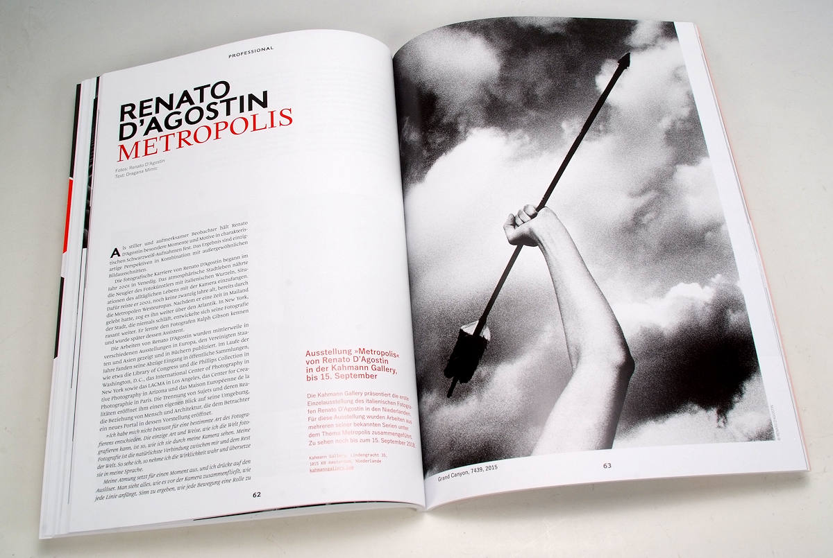 Der Praxisteil des Heftes inspiriert, regt an zum Selbstmachen, zum Weiterentwickeln. Sei es der Beitrag «Licht-Spiele», bei dem es um Lichtarten fürs Studio ebenso geht, wie um korrekte Belichtungsmessung, oder um die «Archäologie des latenten Bildes», der aufzeigt, dass die in alten Kameras vergessenen Filme nicht futsch sind, sondern mit überaus bezaubernden Bildern überraschen können. Dann verblüffen die Fotos «Metropolis» von Renato D’Agostin, der auf eine erfolgreiche Ausstellung in Amsterdam zurückblicken kann. Und weiter gibt Chris Schmid im Talent-Teil des Heftes mit «Silbersalze wirken sehen» einen Einblick in sein Schaffen, der es in kurzer Zeit vom Fotolaboranten zur eigenen Fotogalerie gebracht hatte.