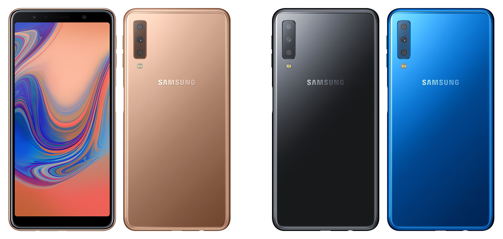 Samsung Galaxy A7 Farbvarianten: Links Vorder- und Rückseite (mit Dreifachkamera) des Modells in der Farbe Gold, rechts die Farnvarianten Schwarz und Blau.