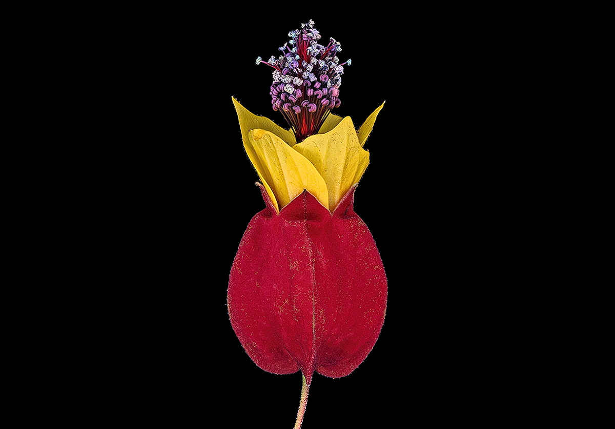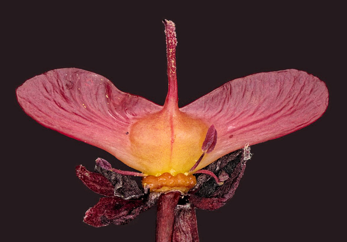Die Schönmalve stammt ursprünglich aus Brasilien, ist eher ein Busch und im Wuchs nicht mit der einheimischen Malven vergleichbar. Sie ist auch als Zimmerahorn und Samtpappel bekannt. Es sieht so aus, als ob, das gelbe Papier, das den geschenkten Blumenstrauss umhüllte, etwas geöffnet und damit in eine rote Vase gestellt wurde. Nikon D810, Rodenstock Rodagon 1:5.6, f = 105mm (in retro), bei Blende 8, 1:1.5, Stack aus 69 Aufnahmen im Abstand von 0.3mm.