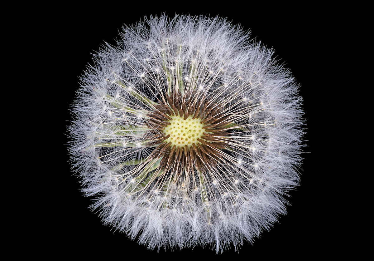 Bekannt und auf jeder Wiese zu sehen ist der Löwenzahn mit seinem geöffneten Fruchtstand. Das kugelförmige Gebilde ist ohne die Stackingmethode kaum von vorne bis hinten formatfüllend scharf abzubilden. Nikon D810, Rodenstock Rodagon 1:5.6, f = 150mm (in retro), bei Blende 8, 1:1, Stack aus 76 Aufnahmen im Abstand von 0.5mm.