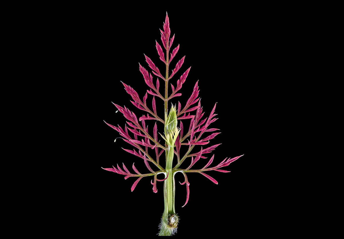 Ein frisches, kleines Blatt des Kerbels ist rot gefärbt, während die Knospen grün ist. Auf der linken Seite erkennt man noch zwei gestielte Eier der Florfliege. Nikon D810, AF Micro Nikkor 105mm 1:2.8 D, bei Blende 8, 1:2, Stack aus 144 Aufnahmen im Abstand von 0.2mm.