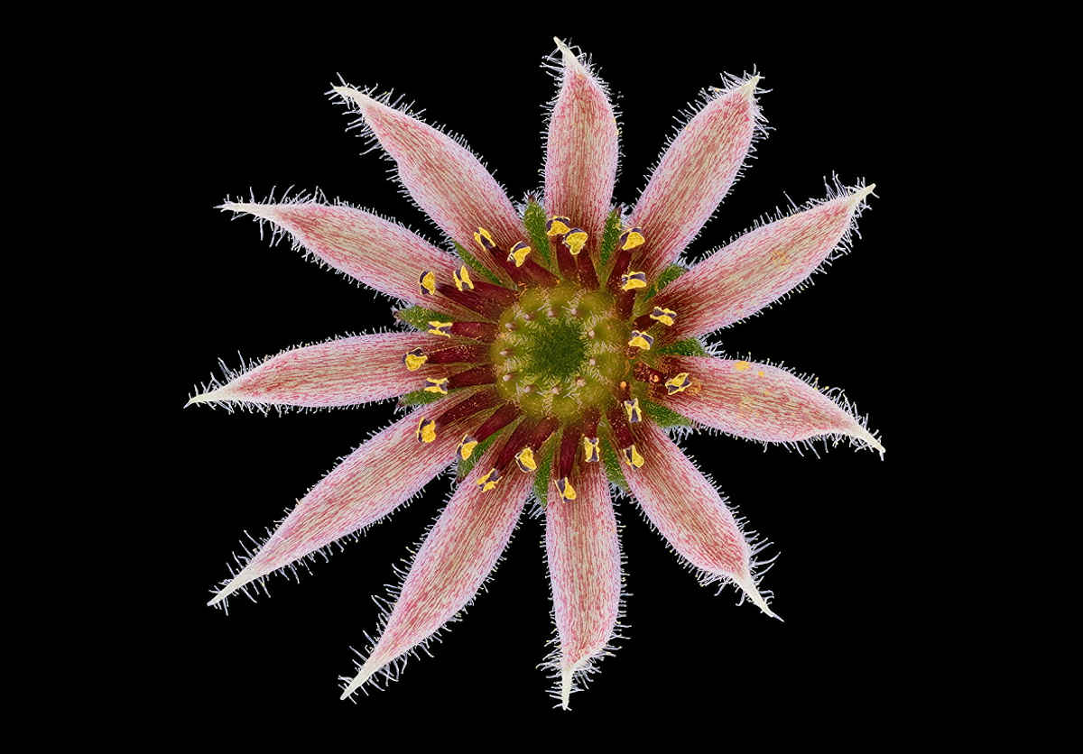 Den Hauswurz findet man natürlicherweise vorwiegend im Gebirge oder in Gärten. Die Blüten sind klein und fein mit ca. 2cm Durchmesser und einer faszinierenden farblichen Vielfalt. Nikon D810, Rodenstock Rodagon 1:5.6, f = 105mm (in retro), bei Blende 8, 1:1, Stack aus 78 Aufnahmen im Abstand von 0.15mm.
