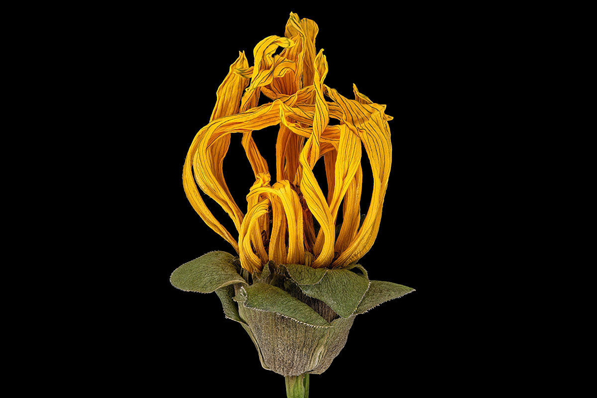 Die vertrocknete Blüte der Durchwachsenen Silphie (Korbblütler) zeigt in den Blütenblättern interessante Streifen, die bei der frischen Blüte nicht vorhanden sind. Nikon D810, Rodenstock APO Rodagon N 1:4, f = 80mm (in retro), bei Blende 8, 1:1.5, Stack aus 79 Aufnahmen im Abstand von 0.25mm.